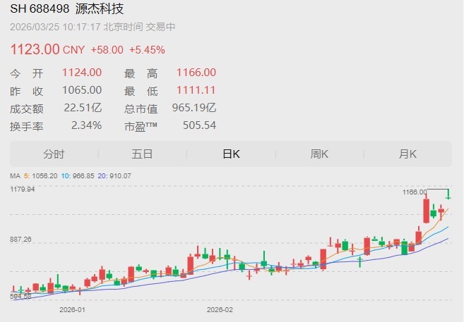 个股方面,光芯片龙头源杰科技开盘大涨超8%,股价再创历史新高,截至发稿有所回落。3月24日晚,源杰科技披露年度报告称,2025年公司实现营收6.01亿元,同比增长138.50%;归母净利润1.91亿元,扣非净利润1.67亿元,均实现扭亏为盈。同时,公司拟每10股派发现金红利7元(含税),每10股转增4.5股。3月20日,源杰科技股价突破1000元,成为A股历史上第八只千元股。