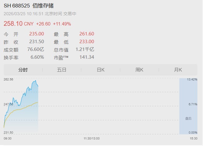 存储龙头佰维存储盘中大涨12%,2025年9月以来,公司股价已累计上涨265%。消息面上,佰维存储3月24日公告称,公司与某存储原厂签订日常经营性采购合同,公司同意按合同约定的数量、价格及时间向该供应商采购某款存储晶圆,合同总承诺采购金额为15亿美元(约103亿元人民币),承诺采购期总计24个月。