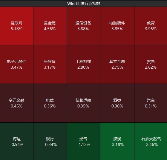 贵金属、互联网、通信设备、基本金属、半导体、化工等概念涨幅居前;石油天然气、煤炭、燃气、银行等概念跌幅居前。