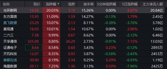 热点板块方面,东数西算概念大爆发,光环新网20%涨停,东方国信、天玑科技盘中涨超10%,真视通、二六三涨停,天孚通信、奥飞数据、海量数据等大涨。